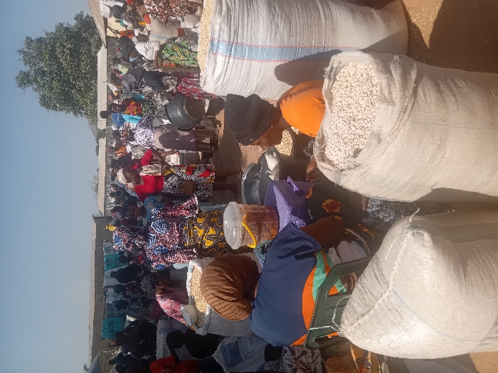 An overhead photograph captures a bustling open-air market in Gurku Gwari, Nigeria, under a clear, bright sky. Numerous individuals, primarily women, are visible, many dressed in vibrantly patterned traditional garments and headwraps. In the immediate foreground, two women are seated. The woman on the left, viewed from behind, wears a brown headwrap and a blue and orange top, occupying a green plastic chair. To her right, another woman, seen in profile, wears an orange top and a dark beanie, attending to items between them. Surrounding these individuals are large white woven sacks, some filled with light brown grains (possibly soybeans), and others with white grains, likely beans or groundnuts. A purple container, a clear plastic container holding reddish items, and a metal bowl are positioned between the seated women. The midground and background are densely populated with market-goers and vendors. People are standing, walking, and engaged in various activities, suggesting active commerce. Some individuals are seen carrying items like a large black plastic basin. The market features rudimentary stalls or temporary structures with light-colored coverings. The ground is dry and dusty earth. In the background, sparse vegetation, including a prominent tree on the right, and distant structures are visible under the intense sunlight.