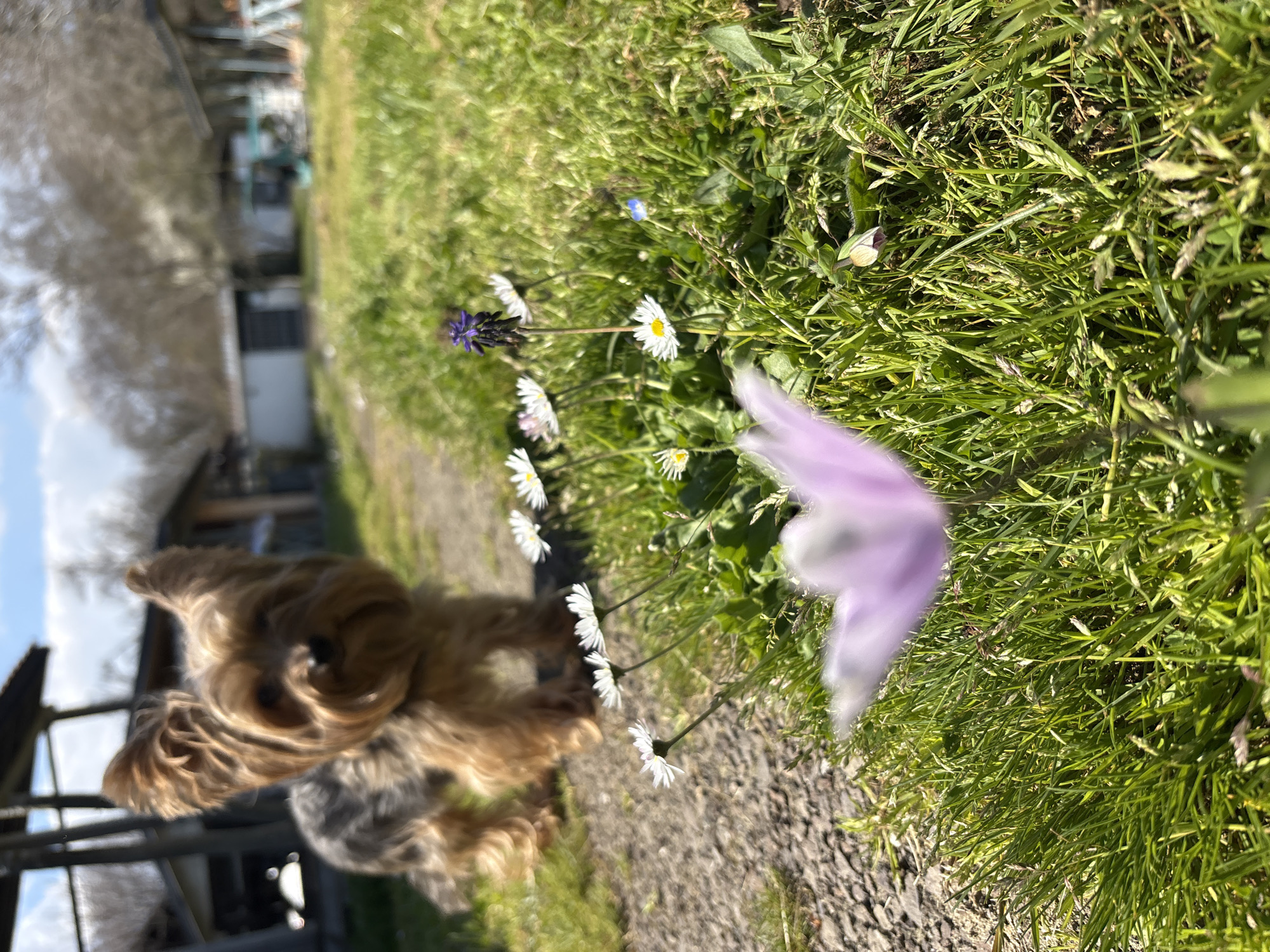 The image is taken at ground level in an outdoor setting, potentially Lozenets, Bulgaria. A brown and grey Yorkshire Terrier is oriented towards a path with a series of daisies and other wildflowers in front of it. A purple flower is prominent in the foreground, slightly out of focus. The path is made of dark grey gravel. Grass borders the path. A partially visible building structure with metal railings and a cloudy sky can be seen in the background to the left. The scene is brightly lit, suggesting it is daytime.