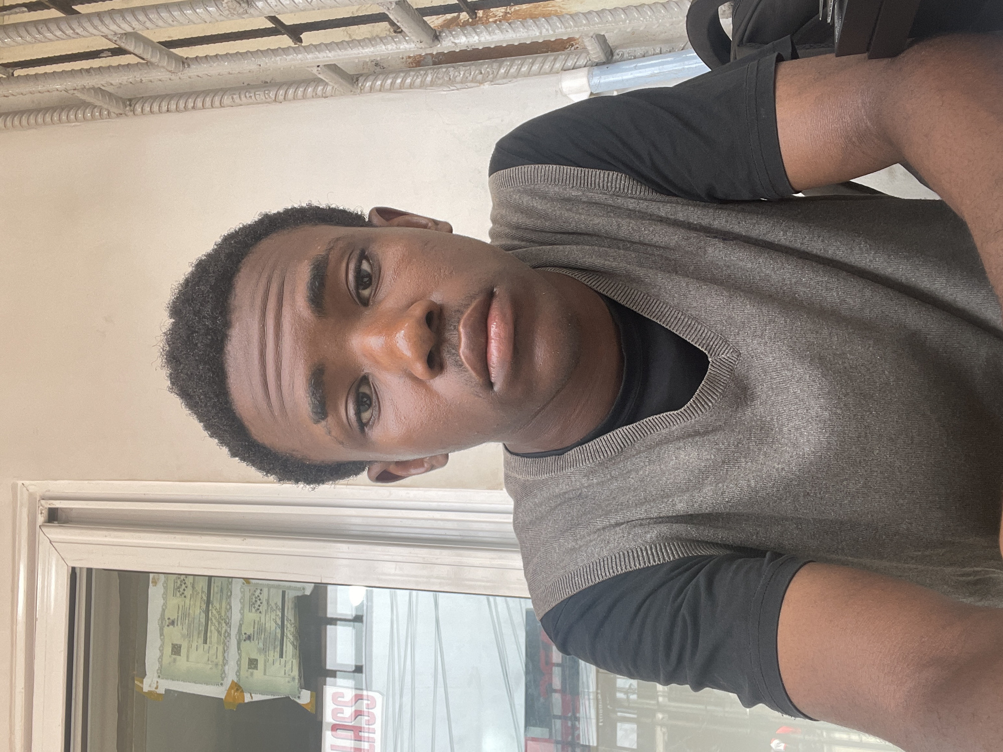 A young male subject with dark skin and short, dark, curly hair is positioned centrally in a chest-up frontal portrait, looking directly at the viewer with a neutral expression. He wears a black short-sleeved t-shirt under a grey knitted V-neck vest. To the subject's left, a white-framed window displays two light green documents, possibly official certificates with indistinguishable text and crests, taped to the interior glass with yellow tape. Below these, a partial red sign with white lettering reads "LASS". Reflections in the window indicate an urban environment beyond. To the subject's right, a light-colored wall is visible, featuring a vertical metal security grille composed of multiple textured, coiled bars. A partial black bag is discernible in the lower right background. The scene depicts an interior or a shaded outdoor area within the city of Ikeja, Nigeria.