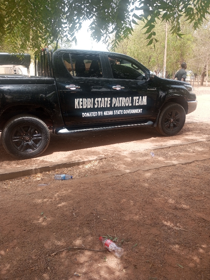 A black pickup truck with the words "Kebbi State Patrol Team" and "Donated by: Kebbi State Government" is parked on a dirt road with a concrete curb