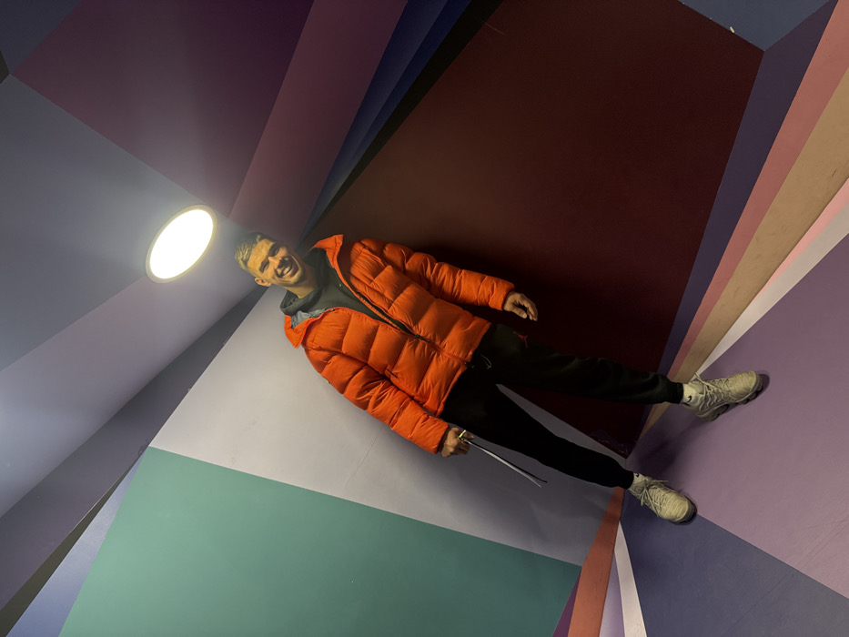 A young adult male stands within a geometrically designed room at the Colorland Museum in Bucharest, Romania