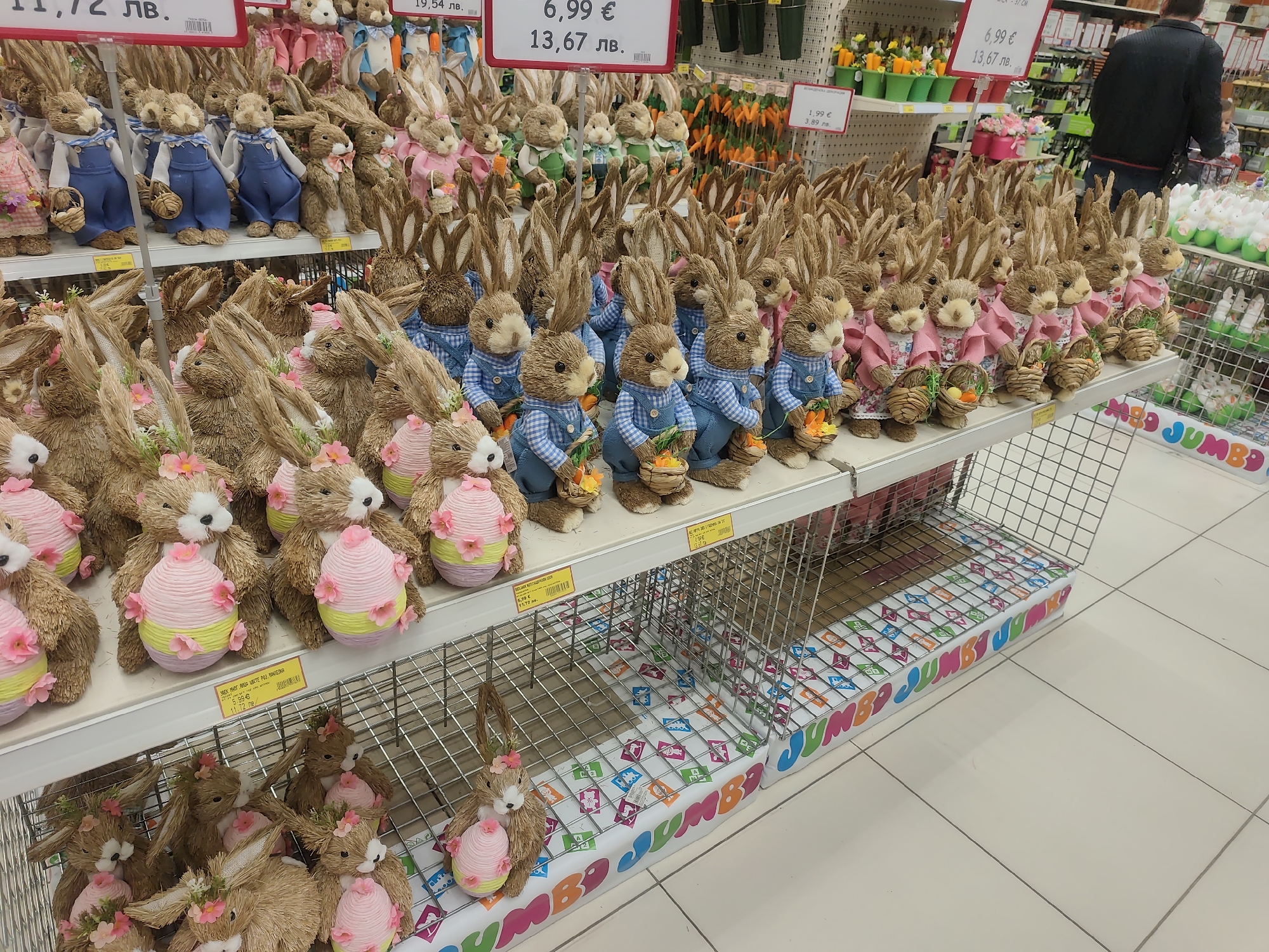 - "Here is a detailed description of the image: The image shows a display of Easter-themed merchandise in a retail store, potentially a "JUMBO" store as indicated by the branding on the display shelves" by FM-0qfYB3, licensed under CC BY 4.0