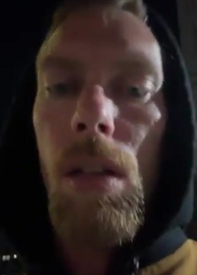 man with a goatee and blondish hair, wearing a black hooded sweatshirt over a tan jacket, standing outside at night. He is looking directly at the camera and talking, his mouth moving as he speaks. He looks up at the sky and then back at the camera. The background appears to be a city street with buildings and streetlights visible.