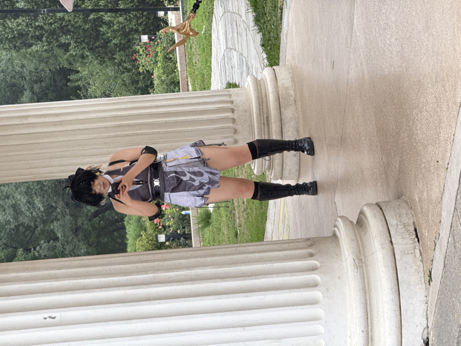 A woman in a dark wig and cosplay outfit poses between large, fluted white columns. She wears a grey and white dress with dark trim, a belt, and black, knee-high boots. Her arms are bent with her hands near her chest. The background shows a lush green space with trees and landscaping. The area looks like a park or garden setting.