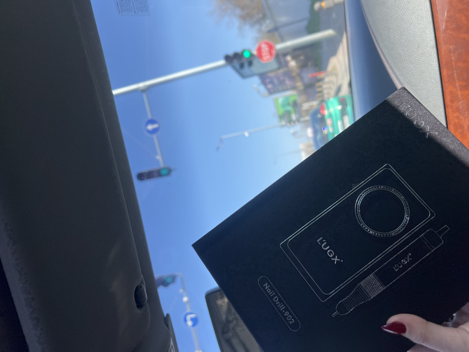 The image captures a scene from inside a vehicle, looking out through the windshield onto a sunny urban street in Plovdiv, Bulgaria. In the lower-left foreground, a hand with red-painted fingernails holds a black product box vertically. The box is branded "LuGX" and labeled "Nail Drill-902," displaying line art of a nail drill and a rectangular device. The vehicle's gray interior roof lining and a portion of the dashboard are visible. The exterior environment depicts a city intersection under a clear blue sky. Two sets of traffic lights are visible; the left set shows a green signal, and the right set also displays a green signal, with a red circular "STOP" sign mounted directly below it on the same pole. Road signs include blue circular directives: one with an upward arrow (straight ahead) centrally positioned and another with a left-turn arrow further to the left. A light green taxi with a white roof sign is observed in the middle distance, traveling or stopped on the road. Utility poles, a blurry billboard with green elements, and bare trees are present along the right side of the street. A precise street name or intersection in Plovdiv is not discernible from the visual information provided.