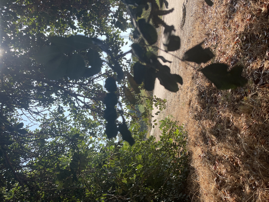 The image presents an outdoor scene captured in the locality of Kfar Vitkin, Israel, under bright daylight with visible sun flare in the upper right. The foreground features a substantial accumulation of dry, light brown grass and fallen leaves, partially obscured by dark, out-of-focus green foliage from a tree branch entering the frame from the upper right. To the left, dense, vibrant green foliage from a bush or tree line is visible. A light-colored dirt or gravel path curves through the midground, extending from the center towards the distant left. Beyond the path, additional green vegetation and trees are present. The background consists of a clear blue sky, with a faint, dark structure, possibly a utility tower, discernible on the right horizon. No individuals, animals, or specific actions are observed within the frame.