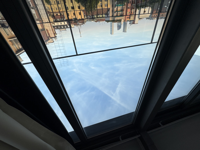 The image displays an exterior view of Milan, Italy, observed from an elevated indoor position through a large, dark-framed window or glass door