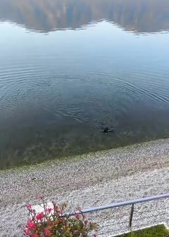 scenic view of a lake surrounded by mountains under a clear sky. The water is calm with visible ripples emanating from a point near the shore. A black dog emerges from the water and walks onto the pebbled beach. In the foreground, a metal railing divides the beach from a patio area where a flowering plant and a small planter are visible.