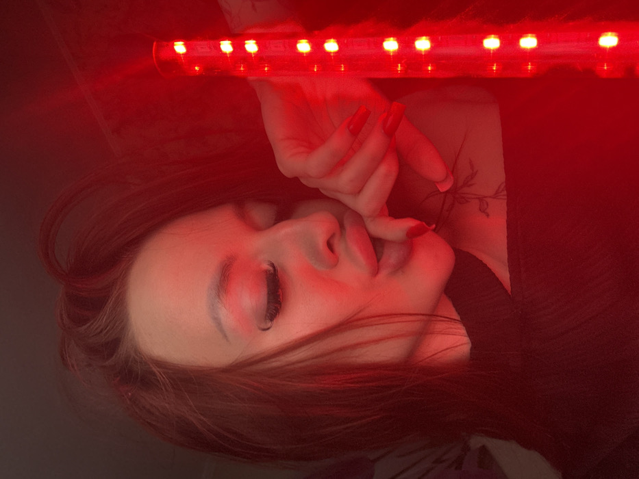 The image displays a head-and-shoulders portrait of an individual, likely female, under intense red lighting. The location within the city of Simferopol, Ukraine, cannot be determined from the visual information provided. The subject has reddish-brown hair, styled away from the face, and appears to have a fair skin tone, heavily saturated with red light. Her eyes are closed, and she has prominent, extended eyelashes. Her lips are full, slightly parted, with the lower lip gently drawn. Her left hand is raised, with fingers touching the area between her lower lip and chin. The nails on this hand are painted red. A tattoo, depicting what appears to be a floral or vine pattern, is visible on the subject's left clavicle/shoulder area. She is wearing a dark-colored garment that covers her neck and shoulder. On the right side of the frame, a vertical, cylindrical object emits a strong red light, consistent with an LED strip or similar light source, featuring multiple distinct light points arranged vertically. The background is indistinct and appears dark, indicating an indoor setting with the red light as the primary illumination. No other subjects or objects are clearly discernible in the environment. The subject is posing, illuminated by the red light source, with her hand positioned near her face.