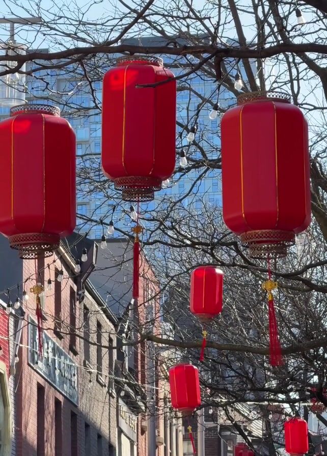 street scene in a neighborhood decorated with red Chinese lanterns hanging from trees