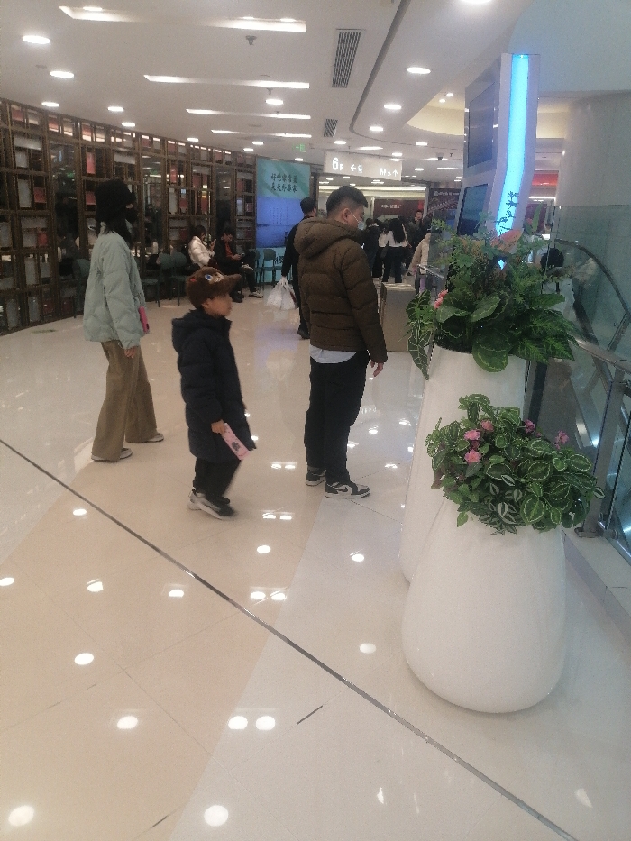 This image depicts an indoor scene within a commercial establishment, likely a shopping mall or large retail space, located in Dongcheng District, China. The environment is brightly lit with numerous overhead recessed lights reflecting on a polished, light-colored tiled floor. In the immediate foreground, from left to right, are three individuals walking generally towards the right side of the frame. The leftmost person is a woman wearing a dark beanie, a light blue or mint-green puffer jacket, wide-leg beige trousers, and light-colored shoes. She carries a small pink object or bag at her side. To her right is a child wearing a brown baseball cap, a dark blue puffer jacket, dark trousers, and white and black athletic shoes. The child holds a pink rectangular object in their right hand. To the child's right, a man in a brown puffer jacket, dark trousers, and black and white athletic shoes is seen from the back, slightly angled to the right. He wears a surgical mask, partially visible. To the right of the man, two large, bulbous white planters are positioned. The upper planter holds lush green foliage, while the lower, smaller planter contains green plants adorned with numerous small pink flowers. An escalator railing is partially visible behind these planters on the far right. In the midground, multiple other individuals are present. Some are seated on chairs near a wall featuring wooden-framed display shelves, potentially holding books or merchandise. Others are standing or walking. A large vertical display column emitting a blue light is visible near an escalator. Overhead, a sign with "6F" (6th floor) and directional arrows, including symbols for escalator/stairs and potentially restrooms, is displayed. Additional Chinese characters are visible on various signs and displays throughout the background, indicating informational or promotional content. The overall impression is a clean, modern commercial interior with active pedestrian traffic.