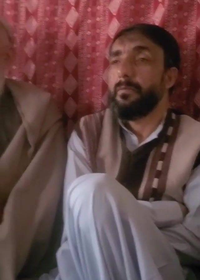 four men sitting on a couch in a room. The walls are a light yellow color, and there is a red patterned curtain behind the men. One man is sitting on the left side of the couch, wearing a brown jacket and light blue pants, with his arms crossed. Next to him is an older man with a long white beard, wearing a similar brown jacket and light pants. The third man is wearing a purple shirt and dark pants, with his arms crossed. The fourth man is wearing a grey shirt and dark pants. All four men appear to be listening to someone or something, but they are not interacting with each other. The camera pans across the men, showing them from different angles.