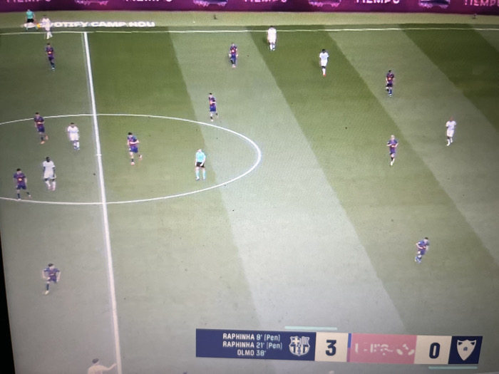 The image displays a digital football (soccer) match, likely from a video game, shown on a screen located in Espoo, Finland. The scene depicts a brightly illuminated, striped green football pitch with white markings for the center circle and a center line. Approximately 17 figures are present: 16 players and 1 referee. Players are identifiable by their kits: one team wears dark blue and maroon stripes (matching FC Barcelona's colors), and the other wears white. They are distributed across the mid-field, suggesting active gameplay. The referee wears a light blue/green top with black shorts and stands near the center circle. An on-screen graphical overlay at the bottom reports goal scorers: "RAPHINHA 9' (Pen)", "RAPHINHA 21' (Pen)", and "OLMO 38'". This scoreboard displays an FC Barcelona crest with a score of "3" against an opposing team, whose obscured crest shows a score of "0". An upper screen banner contains partially visible text, including "NOTIFY CAMP NOU". The overall environment is a virtual representation of a stadium field.