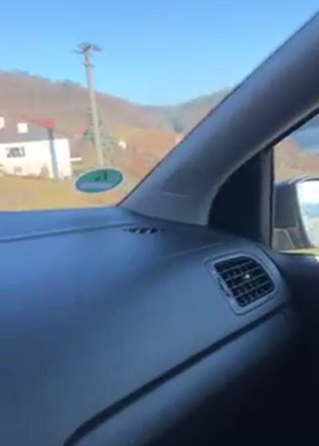 The video is taken from inside a car driving on a sunny day. The car is moving through a rural area with fields and forests visible through the side windows. The camera focuses on the dashboard for a moment, showing the air vents and some controls. Then, it shifts to the front view, revealing a small village street with houses made of red brick or light stucco. Two pedestrians are visible on the left side of the road. A yellow village sign stands on the right. The sky is clear and blue.