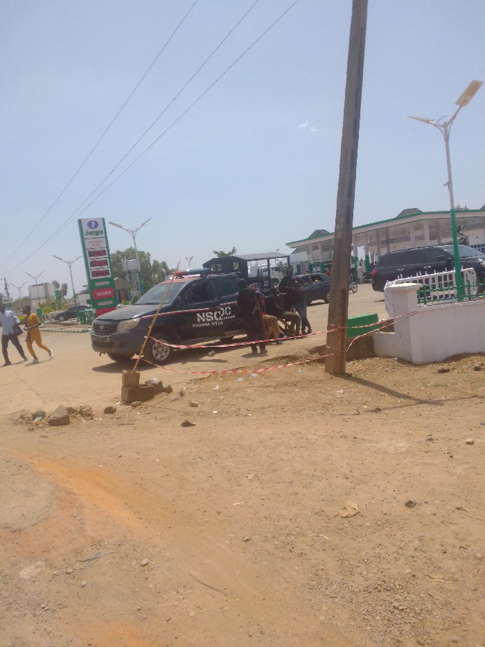 The scene is captured at a Jongre fuel station in Saminaka, Kaduna State, Nigeria, under a clear, bright blue sky. In the immediate foreground, a dirt shoulder exhibits tire tracks and scattered debris. A section of this dirt area is delineated by red and white striped barrier tape, secured to a small stack of bricks and a prominent wooden utility pole on the right. A dark grey pickup truck, identified by "NSCDC KADUNA STATE" markings on its side, is parked on a paved section to the left of the utility pole. This vehicle is equipped with emergency lights on its roof. Approximately 5-7 individuals, dressed in dark clothing, are clustered around the passenger side of the NSCDC truck; one person appears to be seated on or near the truck bed. To the left of the NSCDC vehicle, two individuals are walking away from the scene on a paved surface, one wearing a light blue shirt and the other a yellow top. In the background, the Jongre fuel station features green-roofed pump structures and a tall sign displaying fuel prices, partially visible as 190.00, 200.00, and 220.00. Several other vehicles, including a dark SUV/sedan and a white tanker truck, are present within the fuel station area. Streetlights with solar panels are distributed throughout the background. A white concrete barrier with green accents is visible on the right side of the frame, partially obscured by the utility pole.