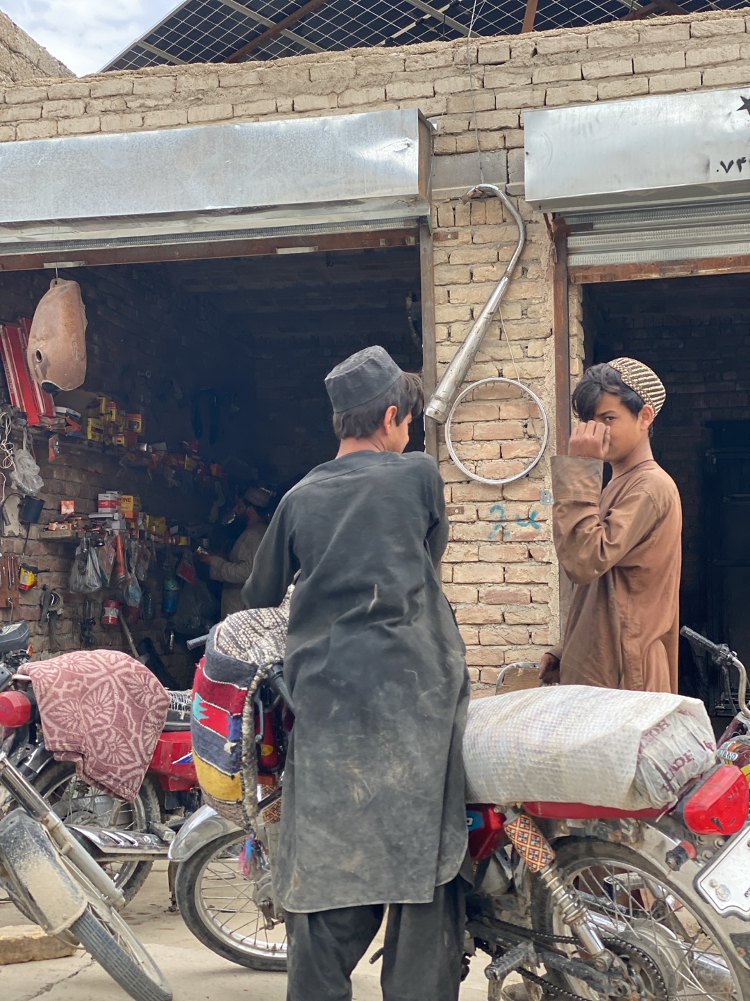 The photograph depicts a street scene in Kandahar, Afghanistan, featuring two boys standing in front of a brick building. The boy on the left is wearing a dark, long shirt and a cap, obscuring his face, while the boy on the right is wearing a brown shirt and a cap, his right hand raised towards his face. The building behind them appears to be a workshop or storefront, displaying various tools and spare parts. A motorcycle is parked in front, loaded with a wrapped package on the back. Additional motorcycles are also parked in the vicinity. Above the storefronts are metal awnings and solar panels are visible on the roof of the building.