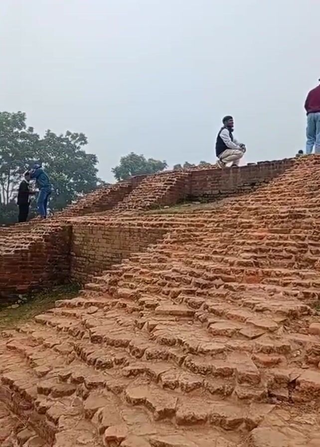 brick structure on a foggy day. Several people are walking around and on top of the structure. The structure appears to be in ruins, with many bricks missing or broken. The ground around the structure is covered in grass and trees.
