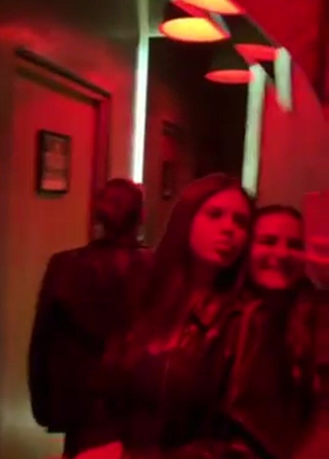 Two women are taking a selfie in a round mirror in a dimly lit room with red lighting. The woman closest to the mirror is pouting her lips. Another person in a black jacket walks behind them towards a door, followed by another person. The room appears to have brick walls, and there are several overhead lights shaped like flat discs.