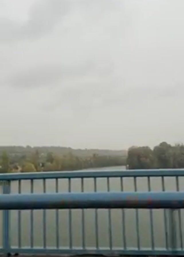 view over a river from a bridge on a cloudy day. The bridge has blue railings. The river is wide and calm, and there is some vegetation on the banks in the distance. It appears to be raining.
