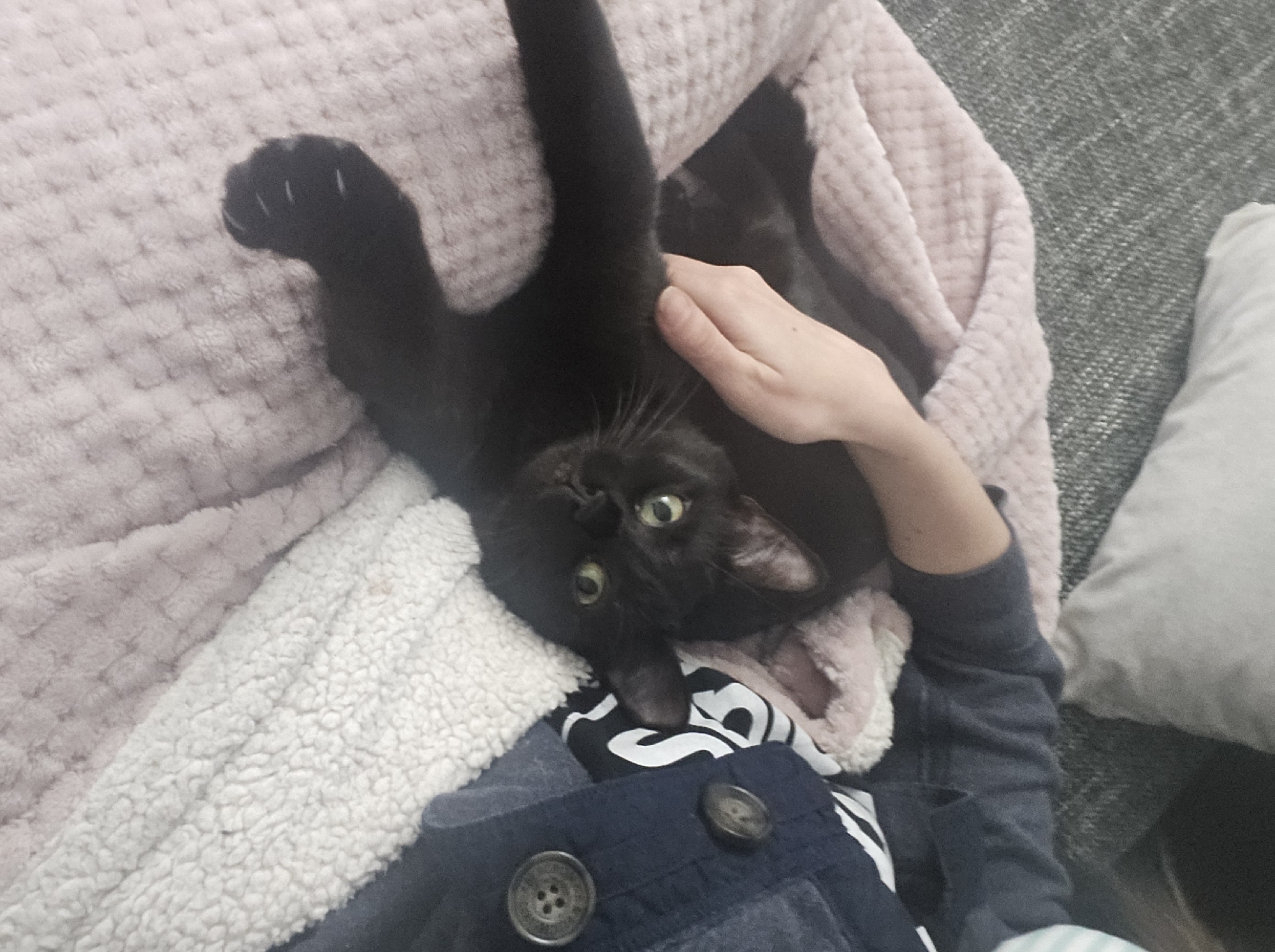 In an indoor domestic setting within the city of Sofia, Bulgaria, a black cat with green eyes is positioned on a pink textured blanket. A human's right arm, clad in a dark blue knitted garment with two prominent brown buttons visible on its front, rests over the cat's midsection, with the hand gently placed on the feline's back. The cat lies facing the viewer, its head slightly elevated, establishing direct eye contact. Its left front paw is extended forward, revealing several visible claws. Adjacent to the cat, and partially beneath the human's arm, a white fluffy blanket is present. A dark grey upholstered surface, likely a sofa or bed, and a white pillow are visible in the upper left background. A black and white patterned fabric is visible beneath the dark blue garment.