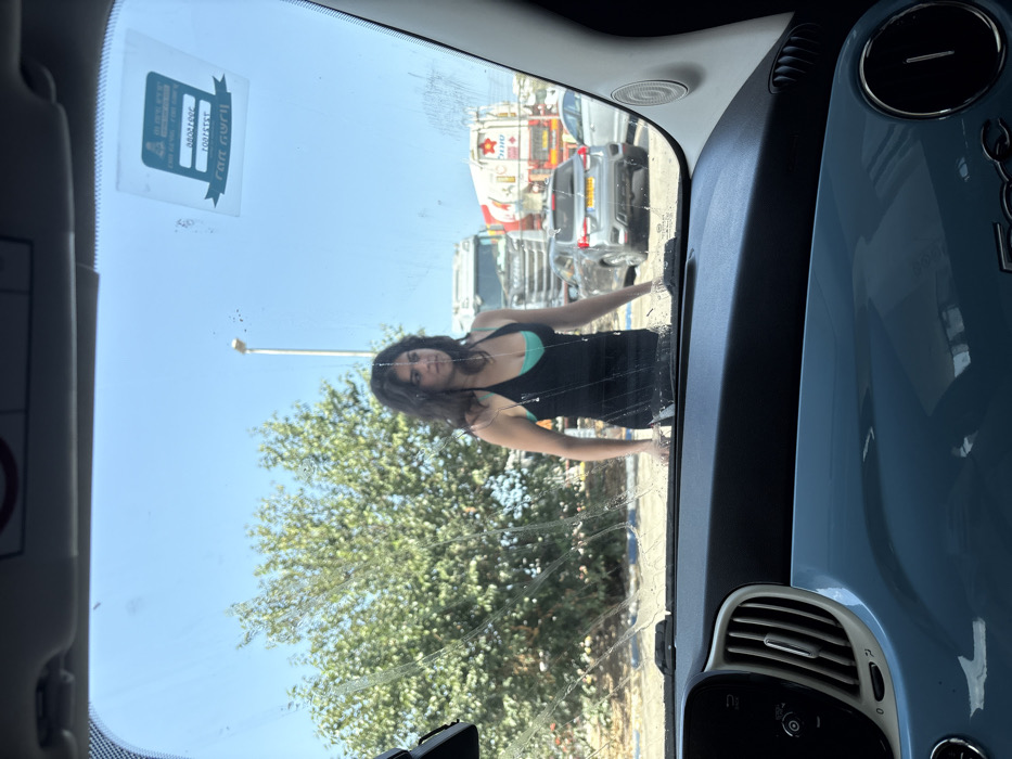 The image captures an outdoor scene from the interior perspective of a vehicle, looking through its streaky windshield