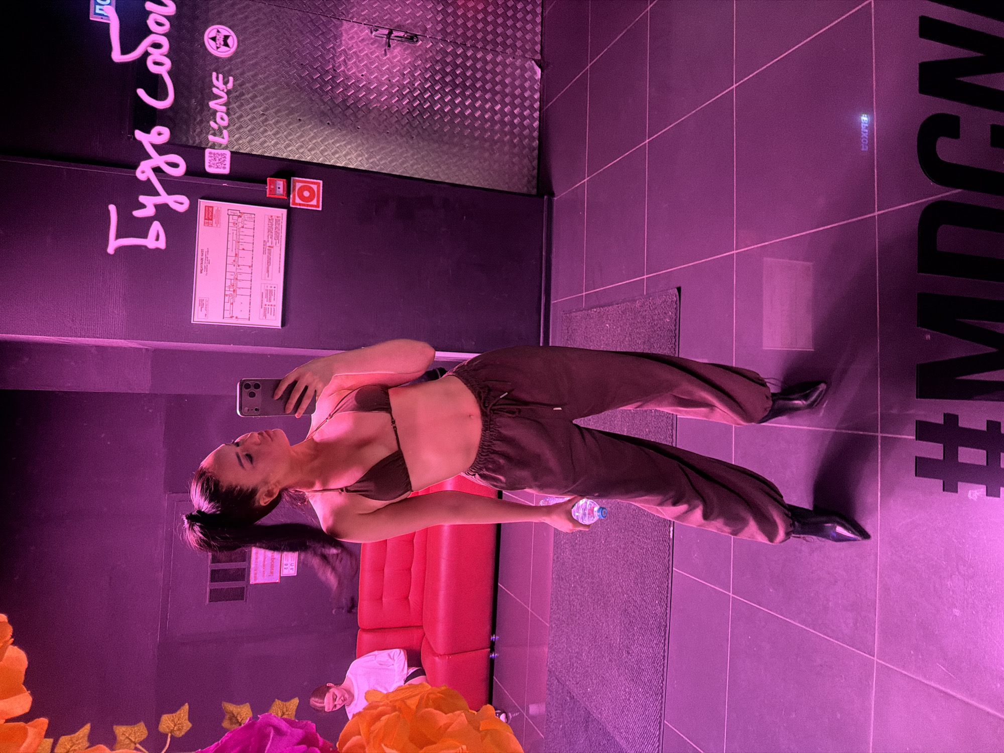 A woman is standing in a purple-lit room, taking a selfie in a mirror. She is wearing a brown two-piece outfit and black shoes, holding a water bottle. Behind her is a red couch and flowers, and a person in a white shirt is visible on the couch. The room appears to be a lounge area with black walls, a metal door, and lettering on the wall. A sign in Russian is on the wall. Given the lettering and signs, the location is likely L'ONE Barbershop at MC DONALD'S on Leningradskaya Street in Khimki, Russia.