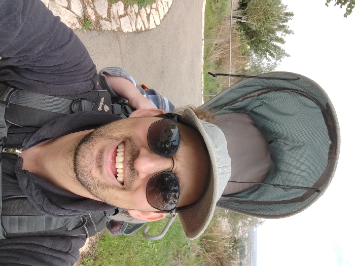 - "A male individual is captured in a selfie, smiling broadly with visible teeth, wearing a gray baseball cap, dark sunglasses, and a dark gray hooded jacket" by FM-3Ip2o1, licensed under CC BY 4.0