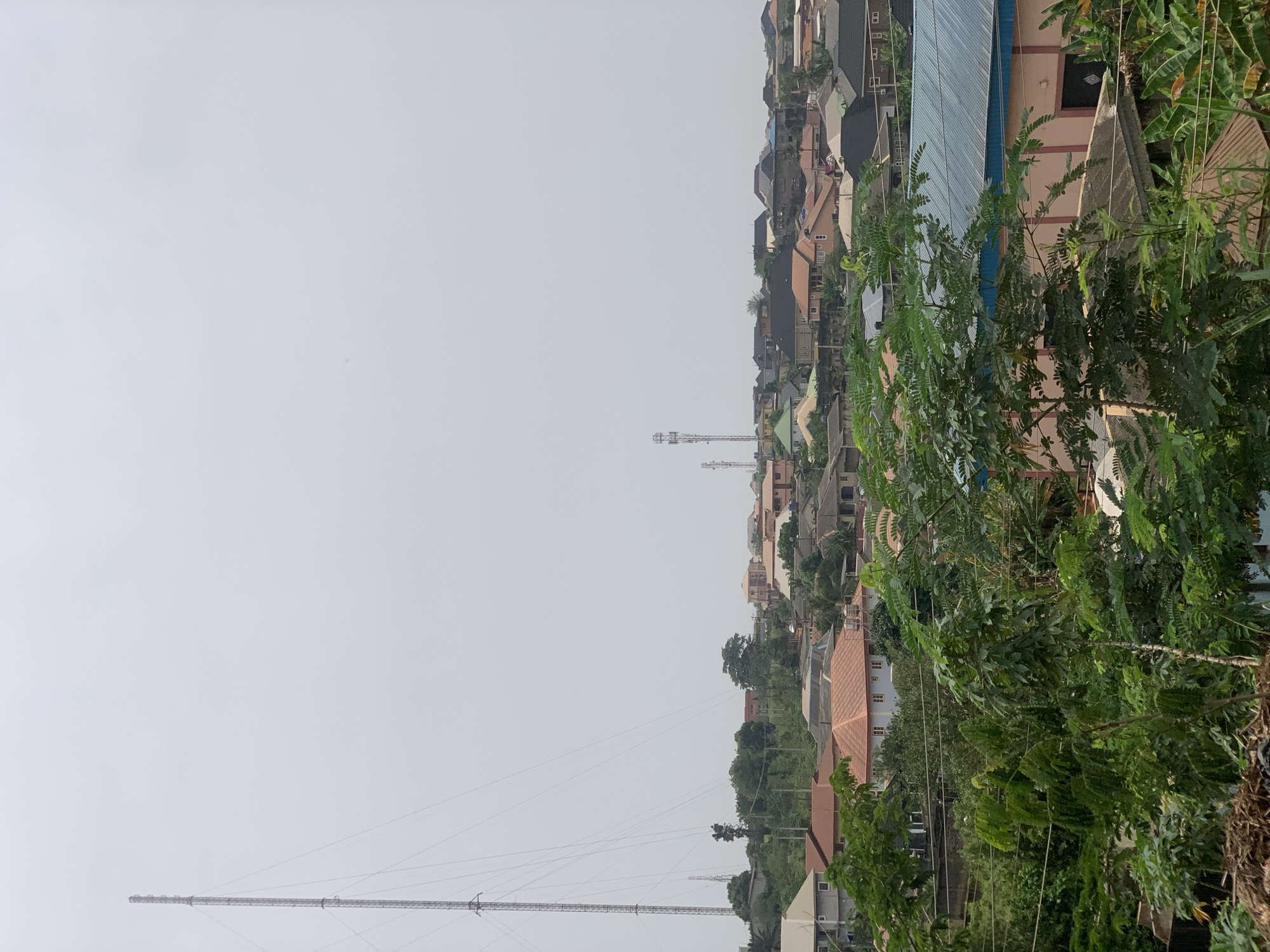 n elevated view of Ikorodu, Nigeria, characterized by a dense arrangement of residential buildings with predominantly brown and grey roofs. In the foreground, green foliage partially obscures the view. Visible are two tall telecommunication towers, one much further away than the other, reaching high into the overcast sky.