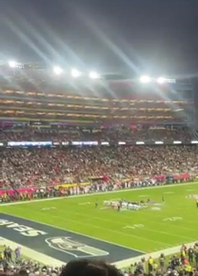 football game in progress at a large, crowded stadium at night. The bright stadium lights illuminate the field, where players in white uniforms are lined up. The stands are full of spectators. "SEATTLE" is visible on the end zone.