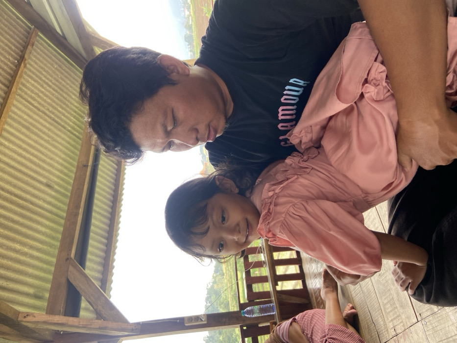 An adult male and a juvenile female are situated within an open-sided shelter featuring a corrugated metal roof and wooden structural elements, in Penanggungan, Indonesia. The male, appearing of Asian descent with dark hair, wears a black t-shirt displaying partial text "GLAMOUR" in a multi-colored gradient; he is positioned holding the juvenile female on his lap, with his gaze directed downwards. The juvenile female, appearing of Asian descent and approximately 4-6 years of age, possesses dark hair and is dressed in a light pink long-sleeved garment with ruffled details on the upper portion. Her facial expression indicates a smile, and her head is turned to her left, with eyes directed slightly upwards. To the immediate left background, a plastic water bottle with a blue cap is positioned on a wooden railing, adjacent to which a white dual electrical outlet is mounted on a vertical wooden post. A third individual's lower extremities, clad in light-colored, possibly patterned fabric, are partially visible on the far left, indicating a seated position on the floor. The external environment visible beyond the shelter's railing consists of extensive green vegetation, consistent with agricultural fields or cultivated landscapes, leading to distant hills or mountains beneath an overcast or bright, diffuse sky. A faint, possibly reddish-roofed structure is discernible on a remote hill.