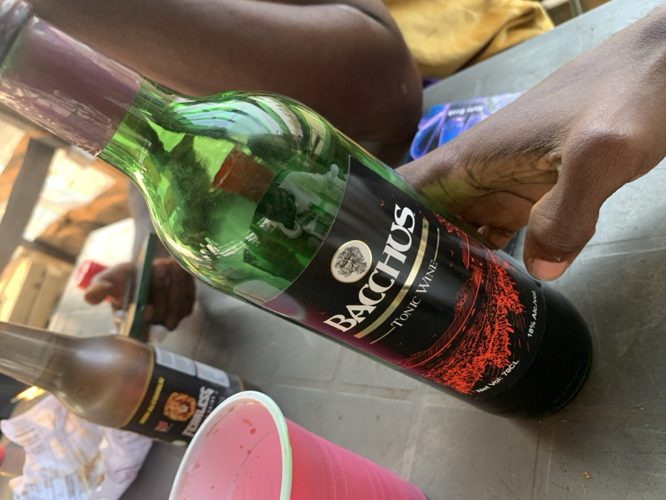 A partially empty green glass bottle of "Bacchus Tonic Wine" sits on a grey plastic surface