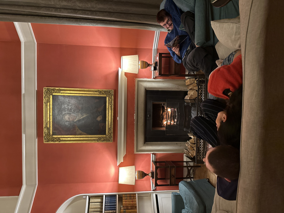 A cozy living room features a lit fireplace flanked by lamps and firewood. A portrait hangs above the mantel on a coral-colored wall with white trim and a bookshelf. Three people relax on a couch: one reading a magazine, another in a red sweater, and a third with their head visible. A blue armchair is partially visible in the scene.