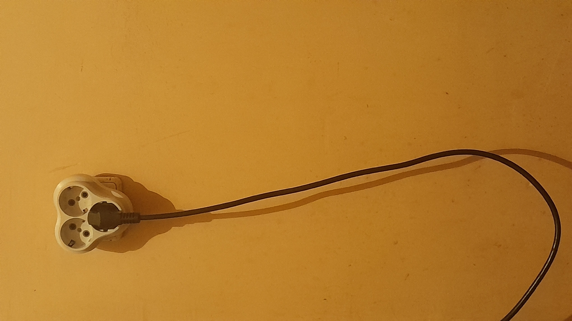 A close-up, still-life photograph depicts a white, triple-socket power adapter plugged into a wall outlet. A black power cord extends from the adapter across a yellow wall. The scene appears to be indoors under artificial lighting. There is no evidence to establish the location of the photo in Svishtov, Bulgaria. No people, subjects, actions, or interactions are visible.