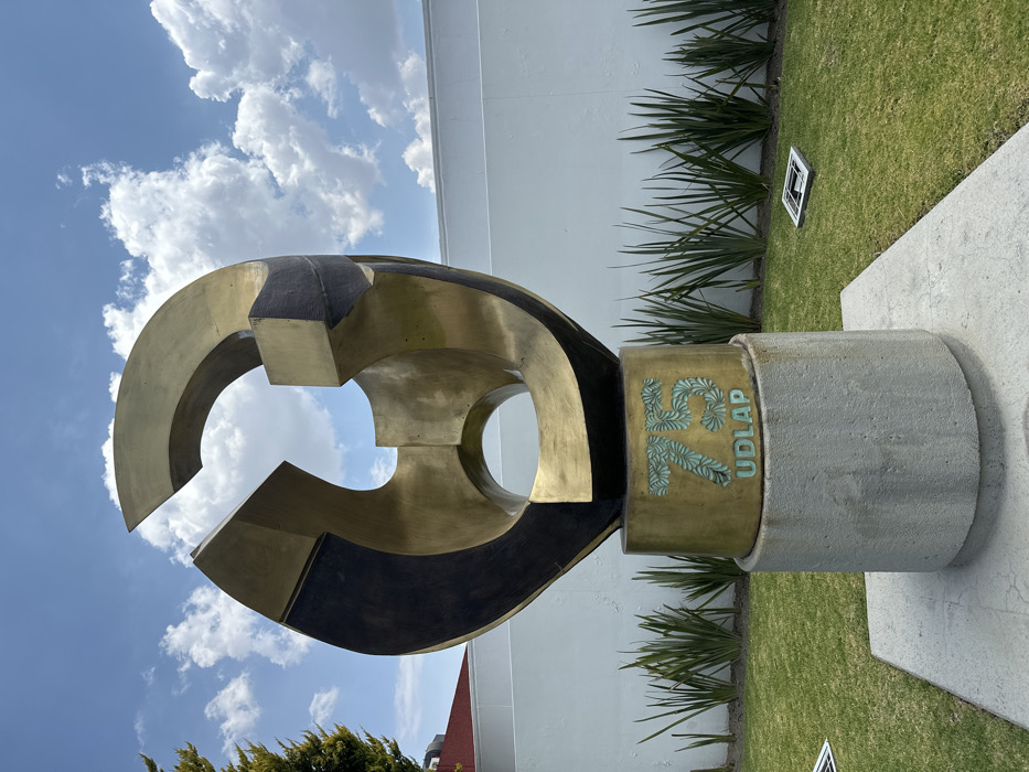 This image captures an outdoor scene in San Andrés Cholula, Mexico, specifically featuring a sculpture on the campus of UDLAP