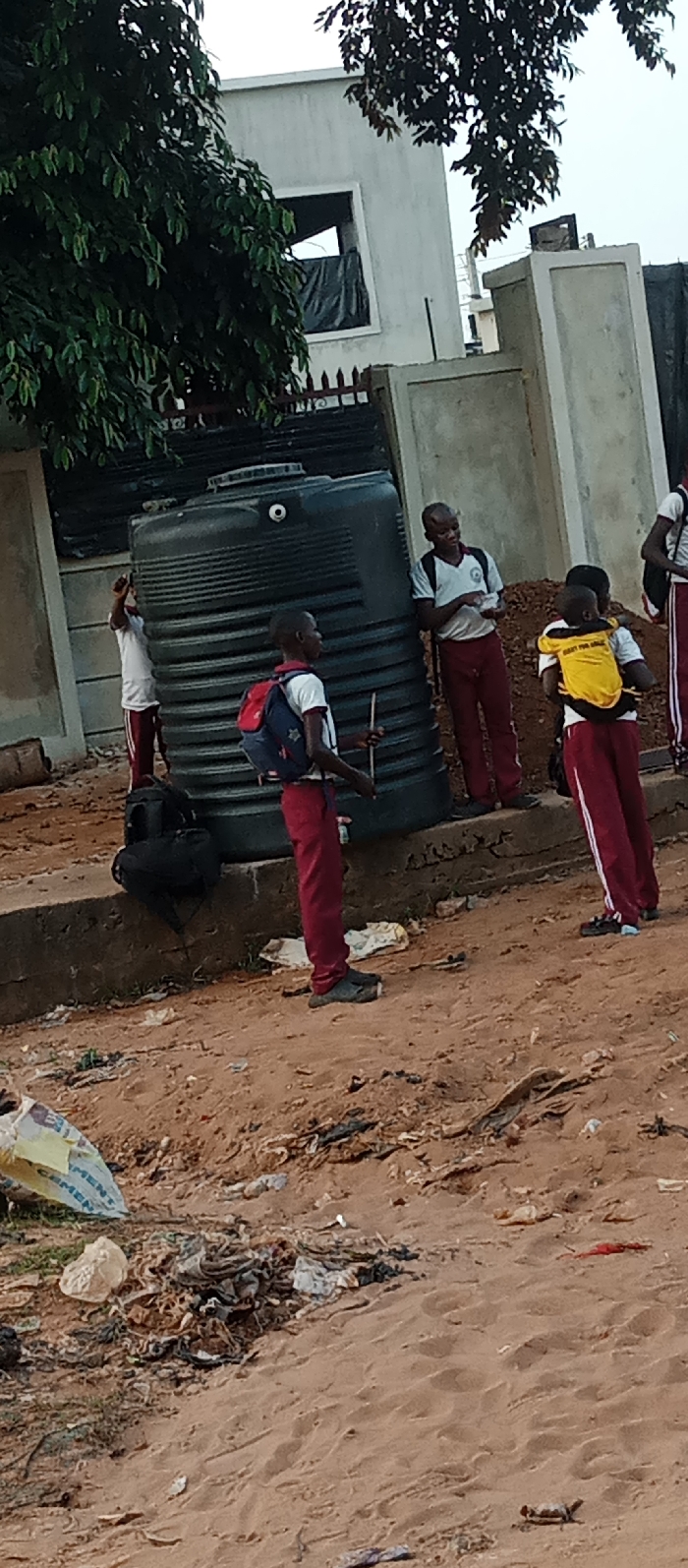 This image depicts an outdoor scene in Onitsha, Nigeria, featuring five male individuals, predominantly students, on a reddish-brown dirt ground with visible litter. In the mid-ground, a large, dark grey, horizontally ribbed, cylindrical plastic water tank is situated on a low concrete ledge. To the left of the tank, a boy in a white short-sleeved shirt and maroon trousers stands facing a light-colored wall, with his right arm raised. To the immediate right of the tank, another boy in a white short-sleeved shirt, maroon trousers, and a blue and black backpack stands in profile, holding a thin, silver-colored object in his right hand. A black backpack rests on the concrete ledge near his feet. Further to the right, a third boy, also in a white shirt and maroon trousers, faces the second boy, holding a small, light-colored object at chest height. A fourth boy, partially obscured, is positioned behind him, carrying a smaller child on his back; the child is wearing a yellow shirt with "BEANS FOR SALE" printed in black text. A fifth boy, partially visible on the far right, wears a similar uniform with white stripes on the side of his maroon trousers. The background features a light-colored, multi-story building with a dark fence or gate below a window opening, which is partially covered by a dark material. Dense green tree foliage is prominent in the upper left, partially obscuring the building. The foreground consists of uneven dirt ground heavily littered with various discarded items, including plastic bags, paper, and what appears to be a torn cement bag in the lower-left corner. The sky is overcast, providing even, diffuse lighting to the scene.