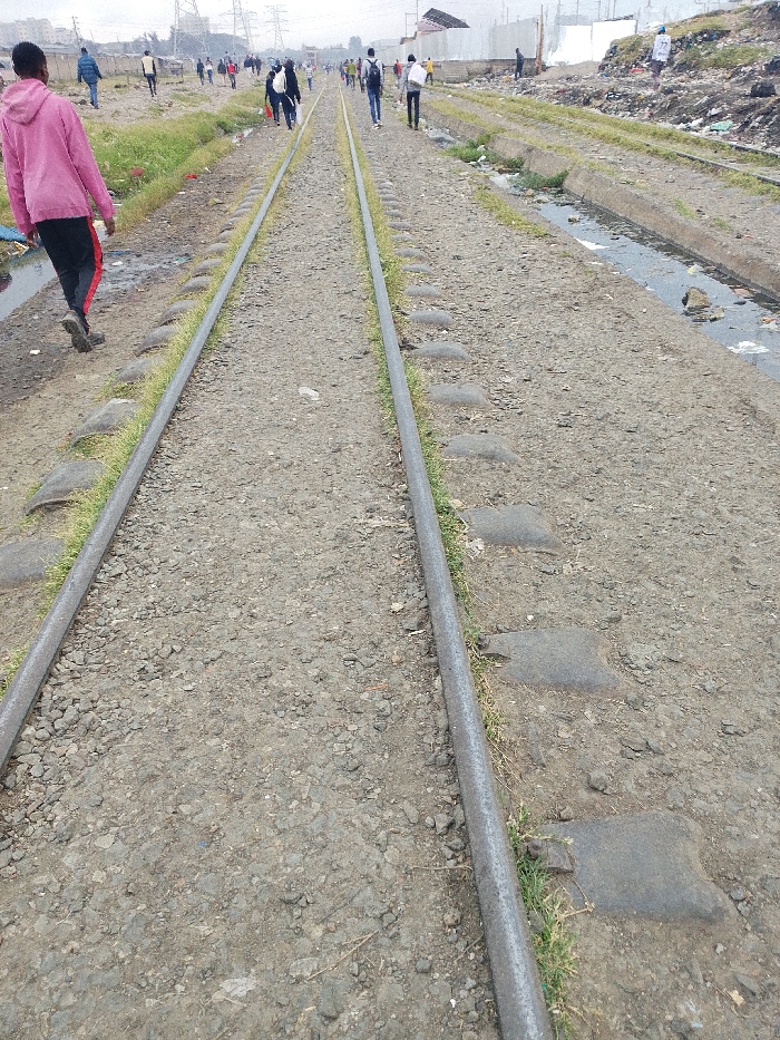 The image displays a railway line extending into the distance, utilized as a pedestrian pathway within an informal settlement in Nairobi, Kenya