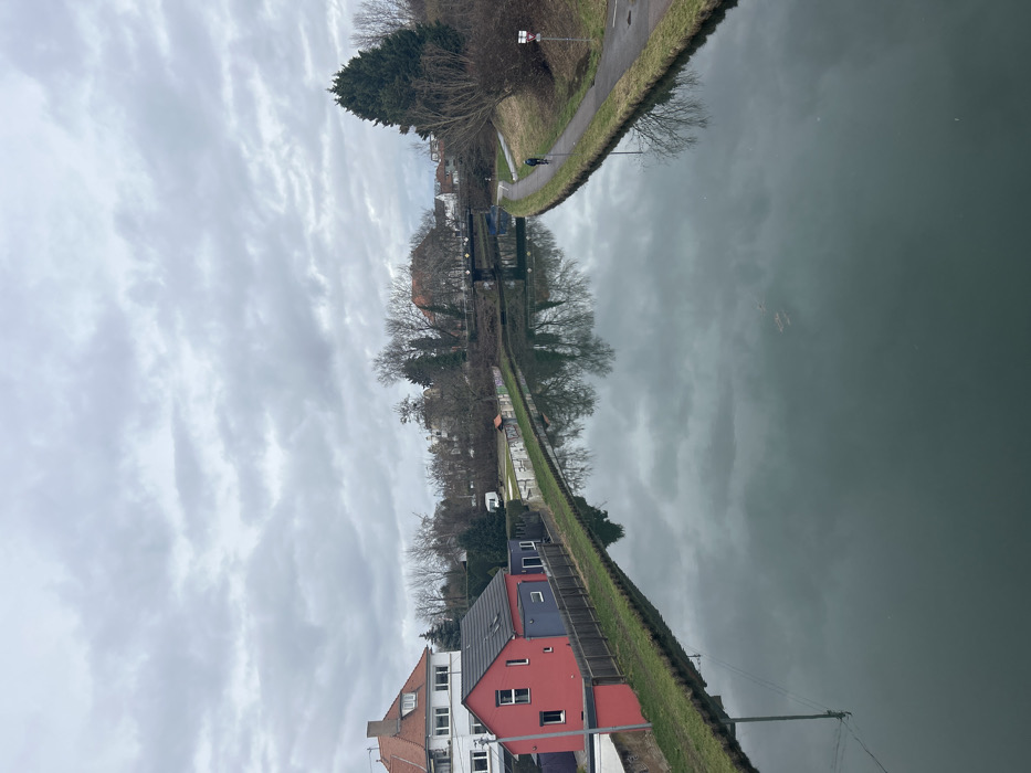 The image depicts a canal scene in Hœnheim, France, under an overcast sky. The calm, dark grey-green canal water dominates the foreground and mid-ground, reflecting the cloudy sky and bare trees along its banks. On the left bank, a strip of green grass borders the water, followed by a dark wooden fence. Behind the fence stands a prominent single-story red house with a dark grey gabled roof and white window frames. Adjacent to it, a smaller, darker grey rectangular structure is visible. Further left and slightly behind, a larger white multi-story house with a reddish-brown tiled roof is present. Beyond these structures, a white panel van is parked on a patch of ground, and various bare deciduous trees and some evergreen foliage extend towards the horizon. A utility pole is partially visible on the far left. The right bank features a paved asphalt path running parallel to the canal. A single individual, dressed in dark attire, is observed riding a bicycle away from the viewer on this path. To the right of the path, a grassy slope rises, populated with bare trees, brush, and a distinct dark green coniferous tree. Two road signs, a triangular yield sign and a rectangular directional sign, are posted near the path. In the mid-ground, a dark, presumably metal, bridge spans the canal, featuring railings and visible supports. Beyond the bridge, additional residential buildings with varying rooflines and more bare trees are discernible against the distant horizon. The reflections of the bridge, trees, and sky are clearly visible on the canal's surface. The overall lighting is diffuse due to the dense cloud cover, suggesting a non-sunny day, possibly in late autumn, winter, or early spring given the bare trees.