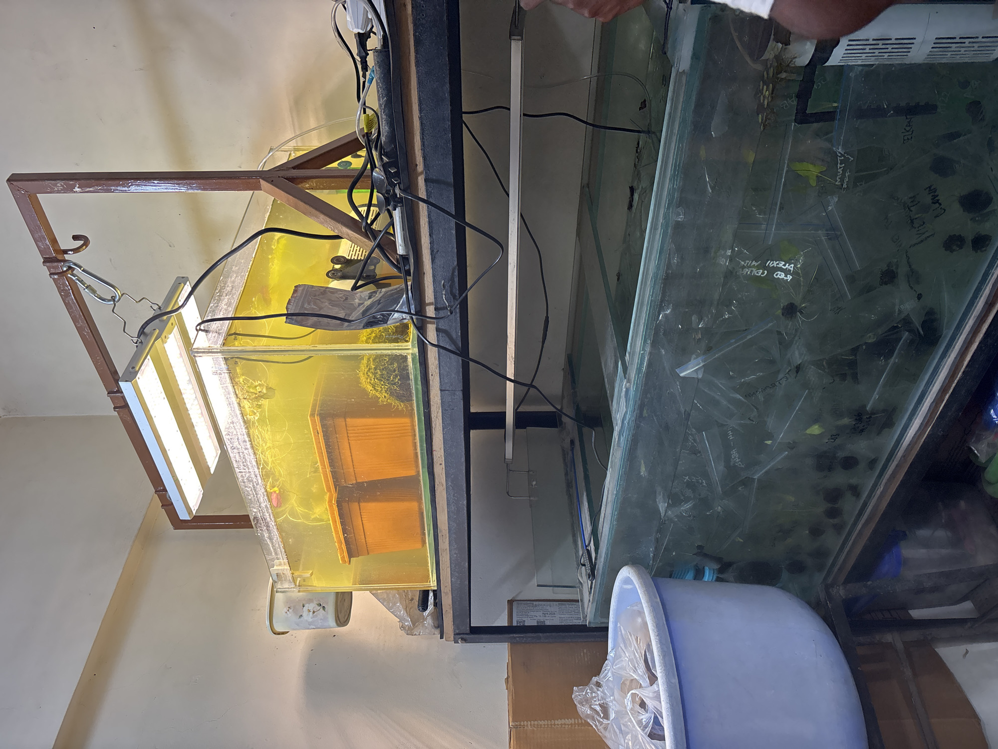 This image depicts an indoor scene in Ulhasnagar, India, featuring an aquatic life cultivation or retail setup