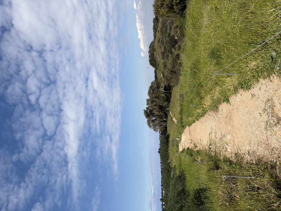 The image presents an outdoor scene located in Kfar Vitkin, Israel, under a bright, partly cloudy sky. A light-brown, unpaved dirt path, approximately 1.5 meters wide, extends from the immediate foreground into the middle distance, veering slightly to the left before disappearing behind a cluster of trees. Along both edges of the path, a low barrier system is installed, consisting of thin, light-colored metal posts with looped tops, through which a single strand of wire is threaded. Approximately 8-10 such posts are visible on each side. The terrain surrounding the path is characterized by lush green grass and weeds, some displaying small yellow flowers, covering fields that recede into the distance. In the midground, to the left of the path, a dense cluster of tall trees with light-colored bark is prominent. To the right, the landscape rises into low, undulating hills densely covered with scrub and bushes. A single small, light-colored bipedal figure is discernible on the path in the far middle distance, walking away from the viewer towards the distant trees. Its form suggests it is either a small child or a medium-sized dog. On the far left horizon, faint outlines of distant structures, likely buildings, are visible, beyond which a hazy horizon line suggests a body of water. To the right, atop a distant hill, a tall, slender structure, possibly a communication tower, rises against the sky. The sky itself is a vivid blue, with numerous scattered white cumulus clouds, varying in size and density, predominantly occupying the upper two-thirds of the frame.