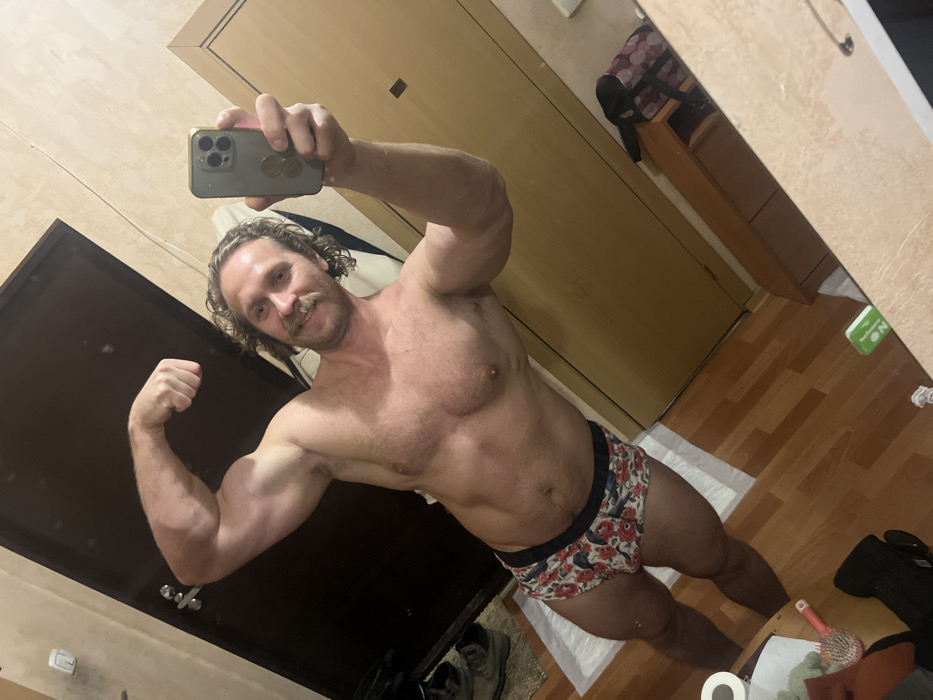 A man poses in a bathroom mirror, flexing his arm muscles while holding a smartphone. He has curly hair, a mustache, and is wearing floral-patterned underwear. The background shows a door, a cabinet, a wooden floor, and other miscellaneous items scattered around the bathroom. The lighting is somewhat dim, contributing to a casual, candid atmosphere.