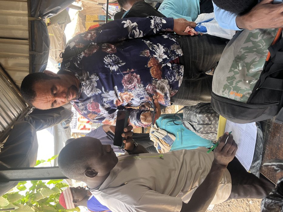 Two adult males are depicted interacting in an outdoor, shaded area in Nyanya, Nigeria, consistent with a market or transportation hub