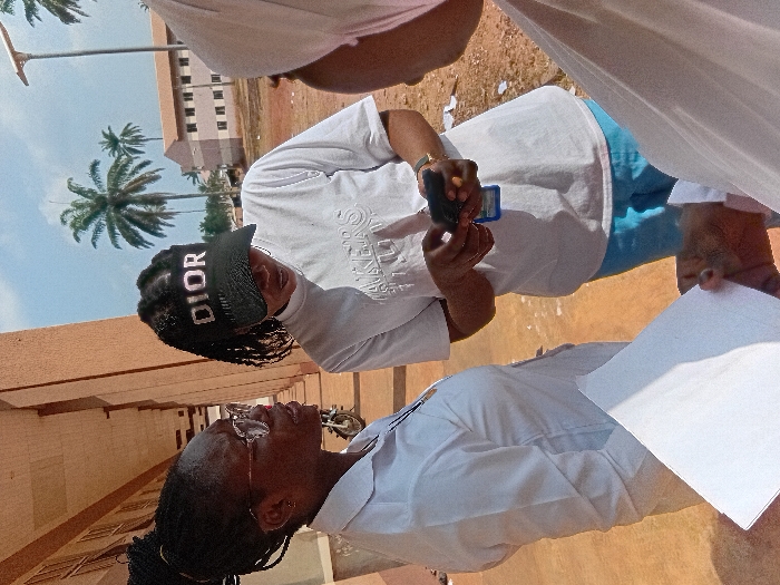 Three individuals stand outdoors. Two women, one wearing glasses and a white top, the other sporting a "DIOR" visor and a white shirt with a design. The woman with the visor is holding a smartphone. Part of a third person in white is visible near the top, slightly out of focus. A building is visible in the background under a partly cloudy sky dotted with palm trees.