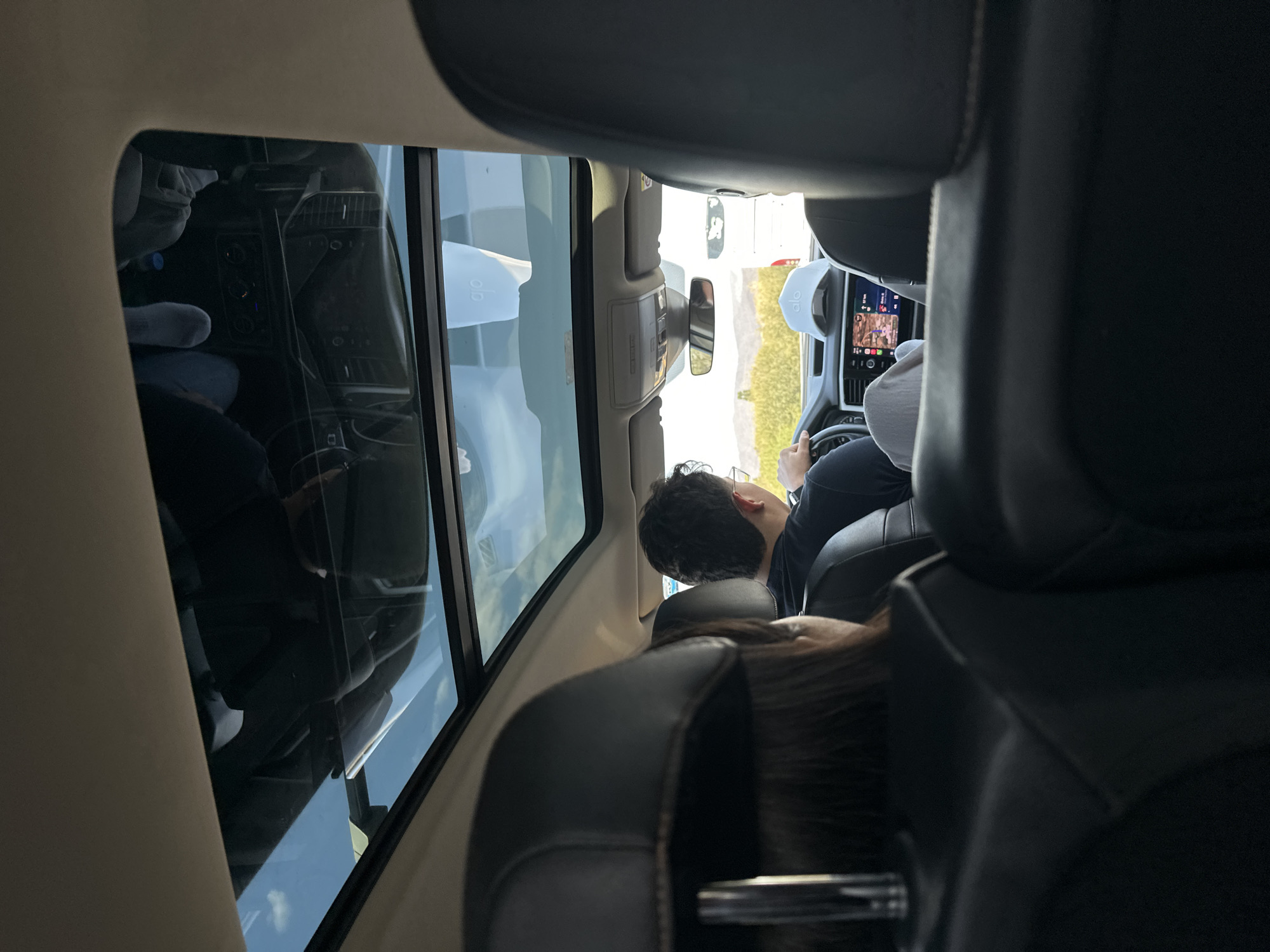 From inside a vehicle, a driver wearing a light-colored baseball cap is seen driving past a building labeled "Alo." A passenger behind the driver is visible, as is another passenger behind them. The photograph was taken with a wide-angle lens through the sunroof. Based on the presence of Spanish on the dashboard screen, it is likely the location is in Mexico. Assuming the building is the Alo Yoga store in Jantetelco, Mexico, it can be determined that the location is in Jantetelco, Mexico.