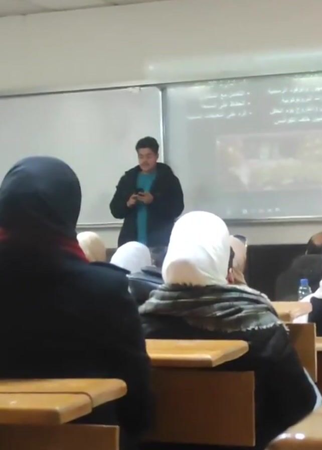 classroom setting with a young man standing at the front of the room looking at his phone. He is wearing a dark jacket over a light blue shirt. In front of him are several people seated at desks, most of whom appear to be women wearing headscarves. A whiteboard is behind the man, with text and images visible on it. The classroom has fluorescent lighting. The camera is positioned behind several of the seated individuals, providing a view of the scene from their perspective.