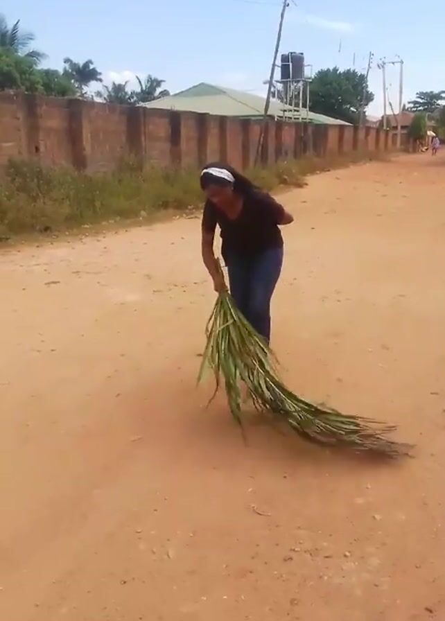 A woman is sweeping a dirt road with a large leafy palm frond. She is wearing a black shirt, blue jeans, and flat sandals. A white headband is around her head. The road is lined with a brick wall on one side and some greenery. In the background, there is a water tower, buildings, and a blue sky with some clouds.