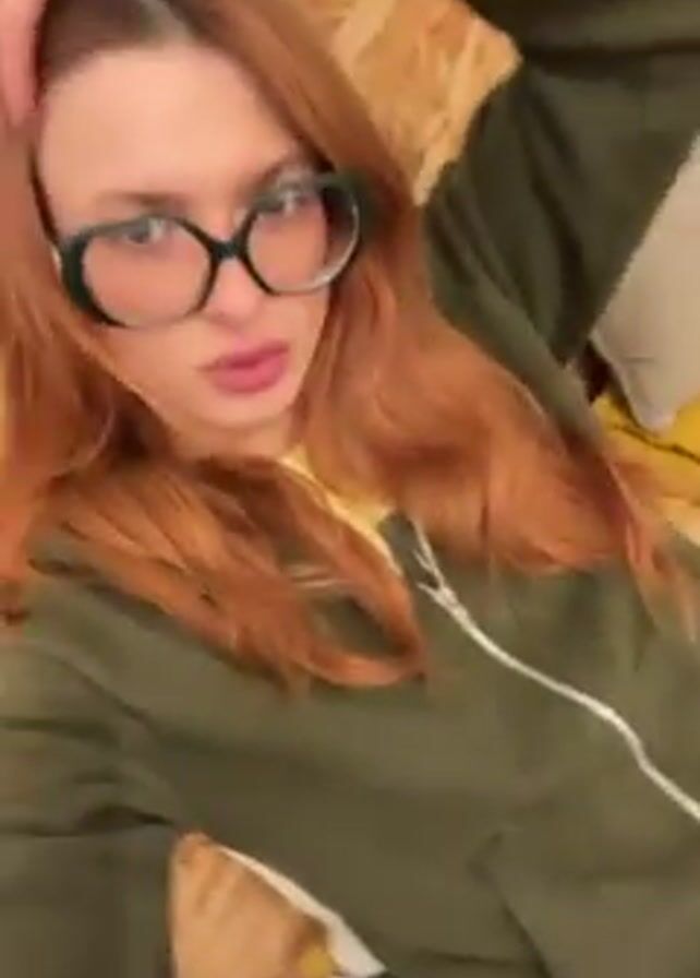 A young woman with red hair and green glasses lies on a wooden surface. She wears a green jacket. She tells the camera she is in a shared apartment with 20 people. The camera pans up to show the apartment, which includes wicker chairs, a wooden table, and framed pictures on the wall.