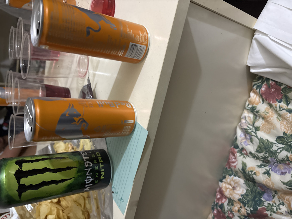 The image displays an indoor scene with various objects resting on a light-colored, possibly white or off-white, flat surface resembling a table or counter. The primary subjects are three energy drink cans: one green Monster Energy Nitro can on the left, partially obstructed by a translucent bag of potato chips, and two orange Red Bull cans positioned to its right. One Red Bull can is open, while the other appears to be closed. Several clear plastic cups, some containing residual dark red liquid, are scattered in the background. A crumpled piece of silver foil and a small, light blue rectangular piece of paper with faint writing are also visible on the surface. Beneath the table, a floral-patterned fabric, likely a bedspread or blanket, with prominent red, orange, purple, and green flowers on a cream background, is visible. The scene suggests the aftermath of a casual gathering or consumption of snacks and beverages. No individuals are clearly present. The image provides no specific visual cues or landmarks to identify a location within the city of Foligno, Italy.