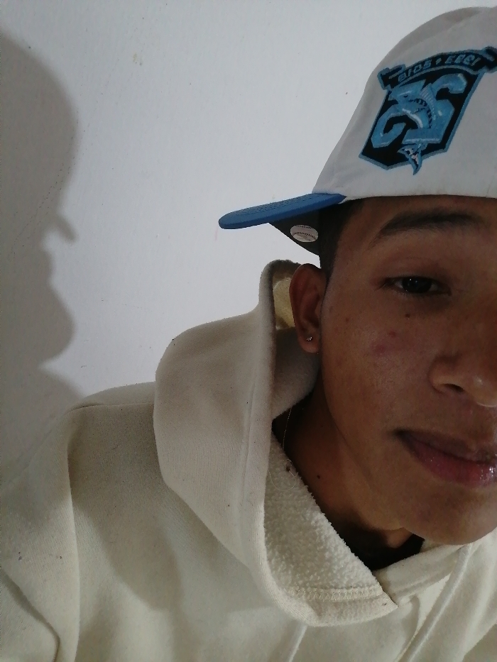 A young man with tan skin is wearing a white hoodie and a white baseball cap with a blue brim and a logo on the front. He is facing the camera, with his face partially visible. His lips are slightly parted, and he has a small stud earring in his left ear. A dark shadow is visible on the white wall behind him.