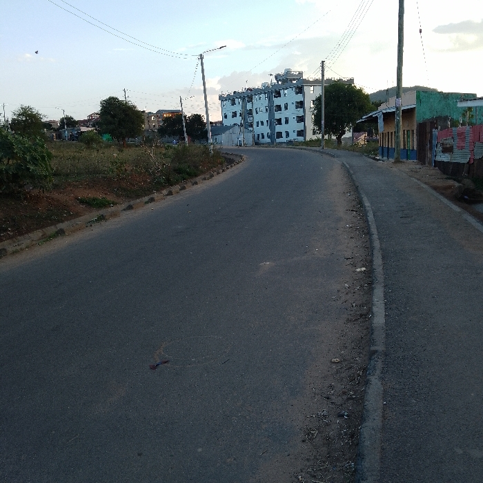 The image depicts a curved asphalt road in Wote, Kenya, under natural, diffused lighting, suggesting either early morning or late afternoon. The road, which is devoid of visible traffic or pedestrians, arcs gradually to the right from the foreground. On the left side, a low curb separates the asphalt from an unpaved area of reddish-brown soil and sparse vegetation, including shrubs and small trees. Further into the distance on this side, additional structures and greenery are discernible. The right side of the road features a raised, paved sidewalk. Immediately adjacent to the sidewalk, a series of single-story buildings line the street. One structure is painted light yellow with blue trim, displaying multiple window openings. Further along, another building is visible with a green facade and a section of corrugated metal fencing or wall. Wooden utility poles with overhead electrical wires run parallel to the road on this side. In the mid-ground, prominently positioned on the right side of the curve, stands a multi-story building, primarily white with blue architectural details, featuring several rooftop water tanks. This structure appears to be an apartment complex. A large green tree is situated immediately behind this building. The distant background reveals indistinct hilly contours or additional urban development under a partly cloudy sky with light blue and faint orange hues. Near the center of the road in the foreground, a dark, elongated object, approximately 15-20 cm in length, lies on the asphalt. Faint white linear markings are present on the road surface around this object. No individuals or vehicles are observed within the frame.