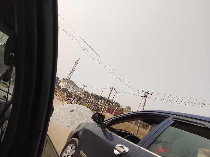 A view from inside a vehicle shows a cloudy sky above power lines and poles. In the distance, a tall structure stands near a large building. A heap of gravel or sand is visible on the side of the road. A blue sedan is parked nearby, partially visible through the car window. The foreground is dominated by the dark frame of the vehicle's interior.